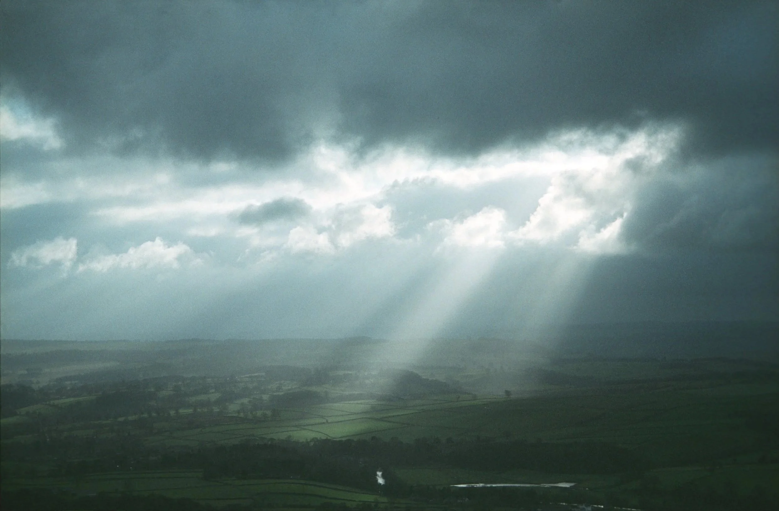 Sunlight breaking through the clouds on an overcast day at Curbar in March.